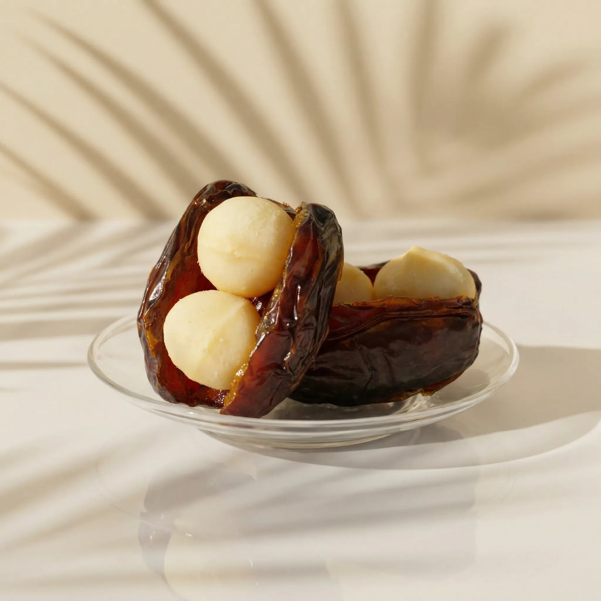 تمر مع مكاديميا - تمر محشو فاخر بمكسرات مكاديميا زبدية