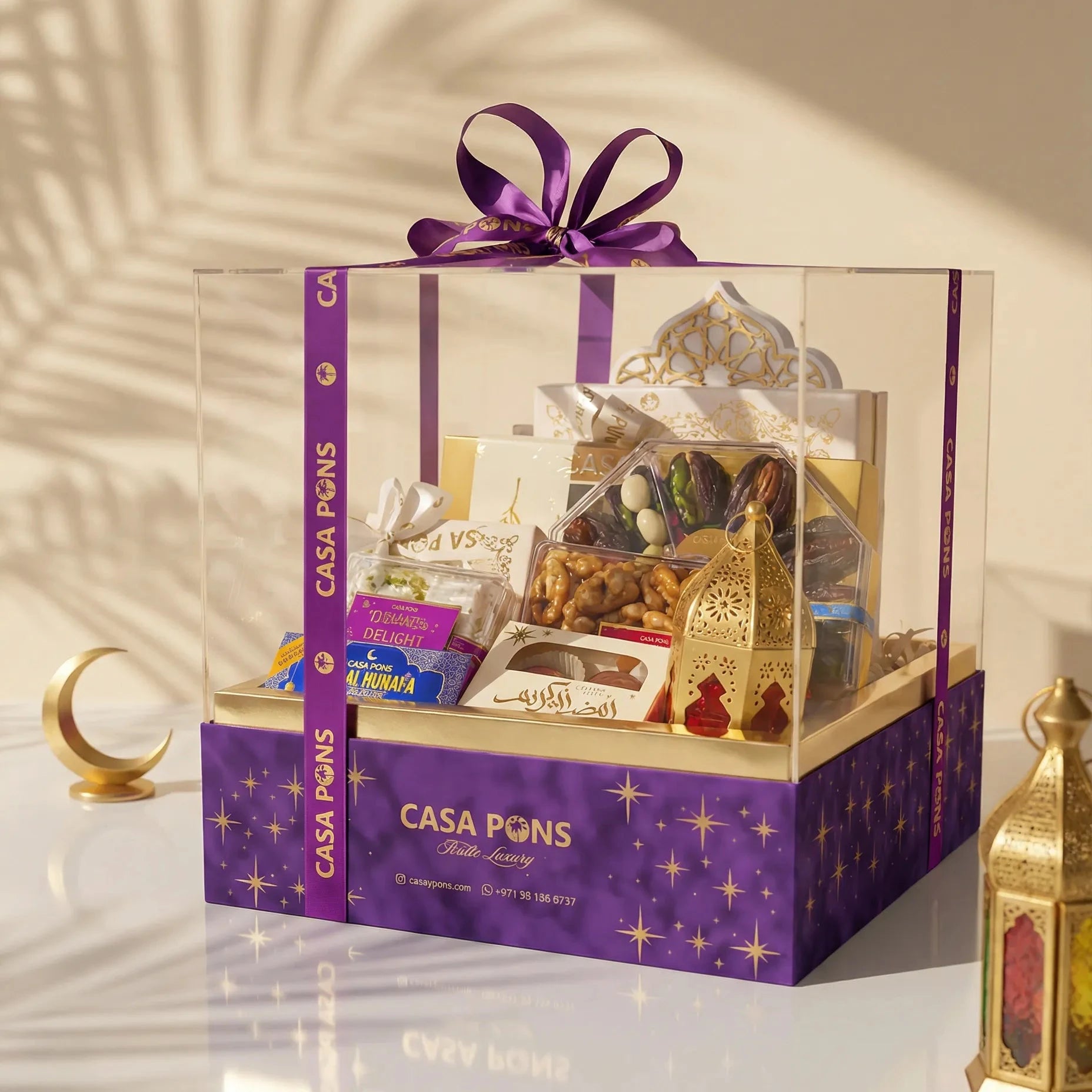 سلة رمضانية فاخرة، نصفها مخملي ونصفها أكريليك، ✨ تحتوي على علبة كبيرة من الكنافة والتمر بشوكولاتة حليب الإبل، وعلبة كبيرة من التمر المحشو بالمشمش المجفف والخوخ الخالي من البذور، وعلبة صغيرة من كراميل البقان، ولوح كنافة بالشوكولاتة، وعلبة صغيرة من ترافل أوريو، بالإضافة إلى زجاجة شراب التمر المميزة لدينا. كل ذلك مع فانوس رمضان الفاخر وقوس ذهبي جميل.⭐️