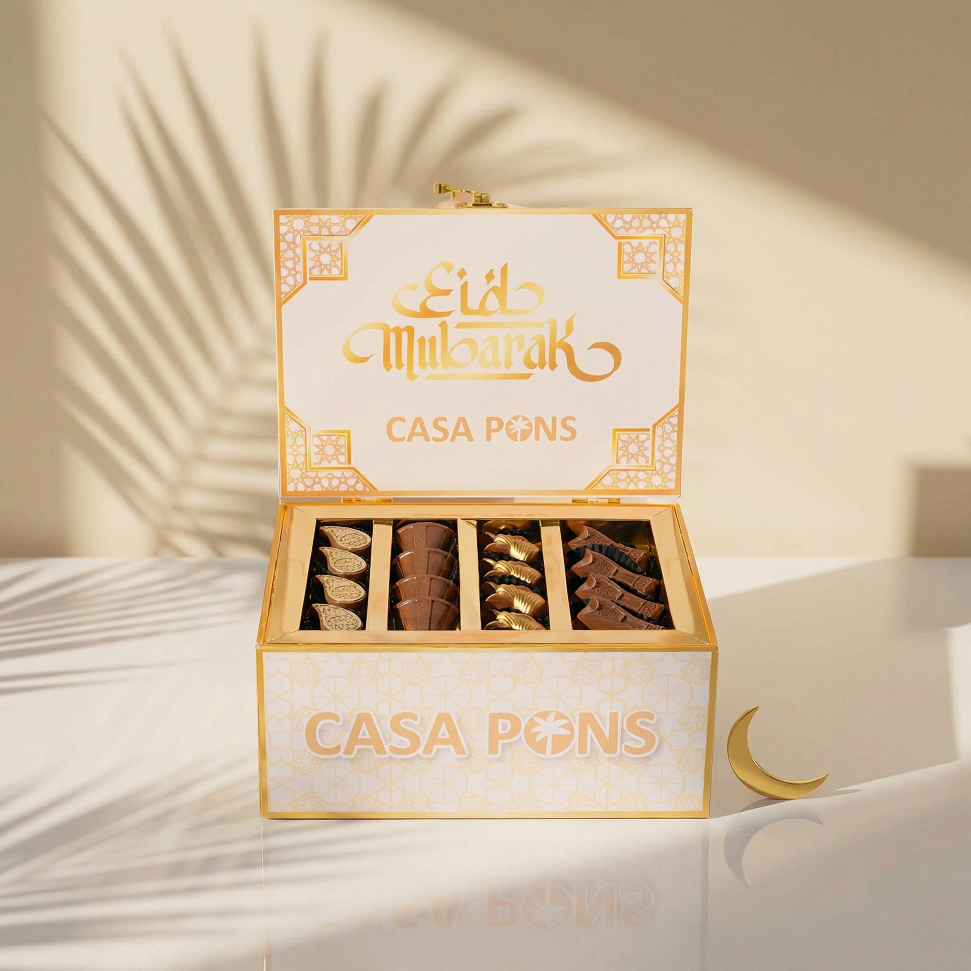 علبة شوكولاتة العيد الصغيرة هدية فاخرة تجمع بين المتعة والجمال. تحتوي على 4 قوالب مستوحاة من شهر رمضان: الدلة العربية، والمبخارة، وقطرة العين، وكوب القهوة العربية.