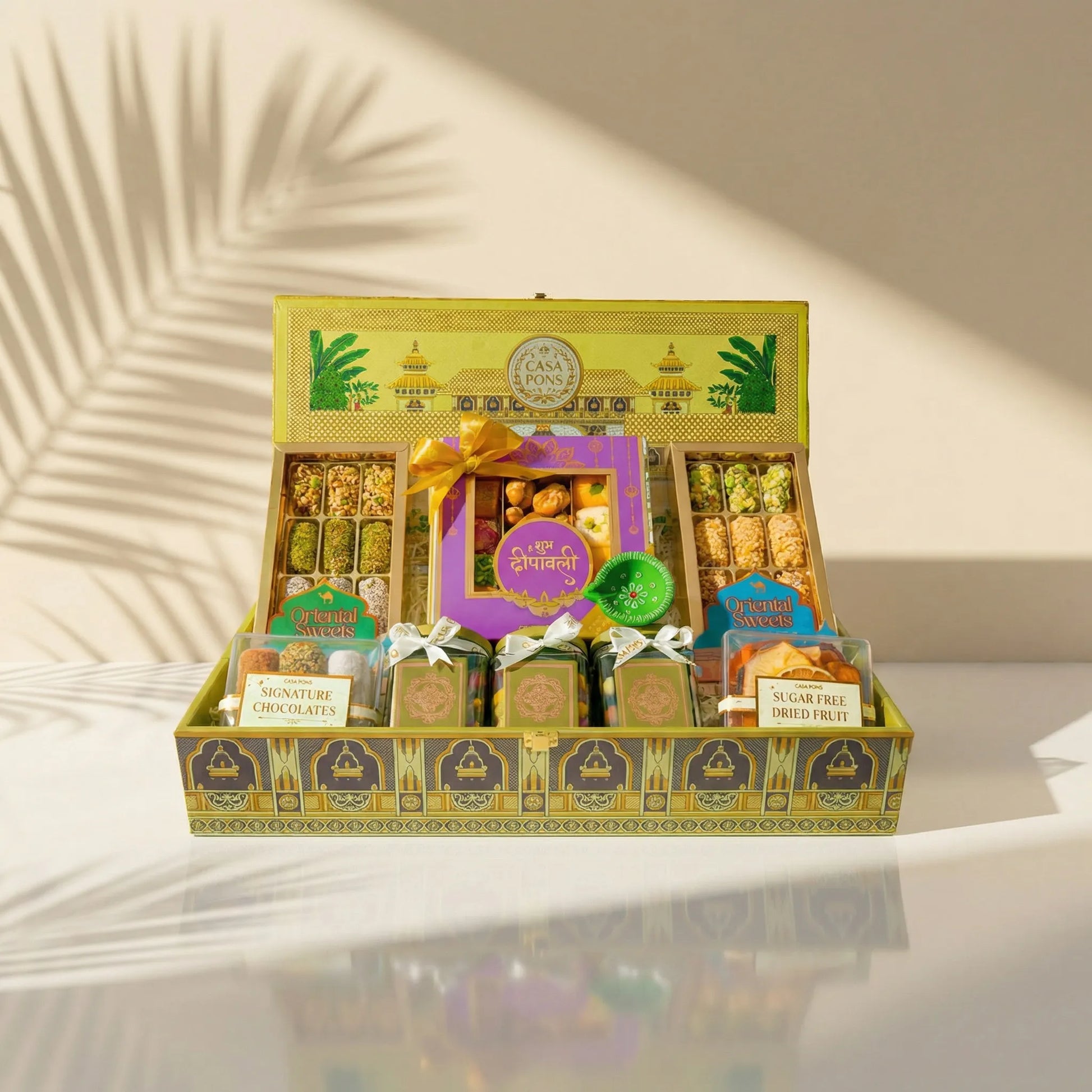 تحتوي السلة على صندوق ديوالي بنفسجي جميل مليء بجوز البقان المميز لدينا، والحلويات التقليدية، ومجموعة متنوعة من عجينة اللوز، بالإضافة إلى صندوقين كبيرين من تمور الشوكولاتة وكرات التمر المتنوعة. كما تحتوي على صندوقين صغيرين من الأكريليك من رقائق الشوكولاتة والفواكه المجففة الخالية من السكر. كما تحتوي على 3 برطمانات صغيرة من المكسرات الصحية المشكلة، وحلوى السكر الملونة، وحلوى الشوكولاتة، وجميعها مزينة بزينة تقليدية وصندوق هندي مصنوع يدويًا.