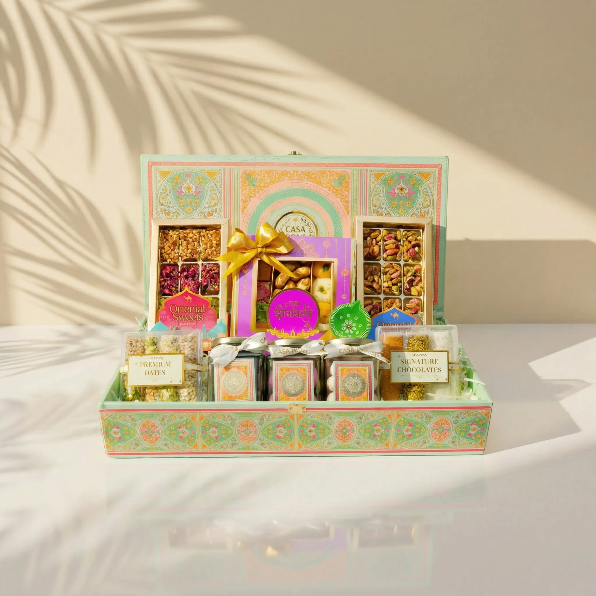 احتفلوا بعيد ديوالي مع سلة رويال ماندالا المستطيلة الكبيرة ، وهي تشكيلة فاخرة من حلويات كازا بونس الاحتفالية. تحتوي السلة على صندوق ديوالي فاخر مليء بجوز البقان المميز لدينا، والحلويات التقليدية، ومجموعة متنوعة من المرزبان، بالإضافة إلى صندوقين كبيرين من حلوى الملبان المتنوعة وحلوى الملبان بالفستق.