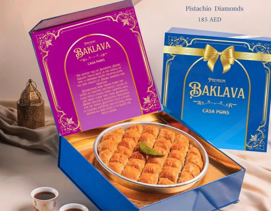 Pistachio Diamonds, exquisite, jewel-shaped baklava filled with finest pistachios. Perfect for gifting or savoring .