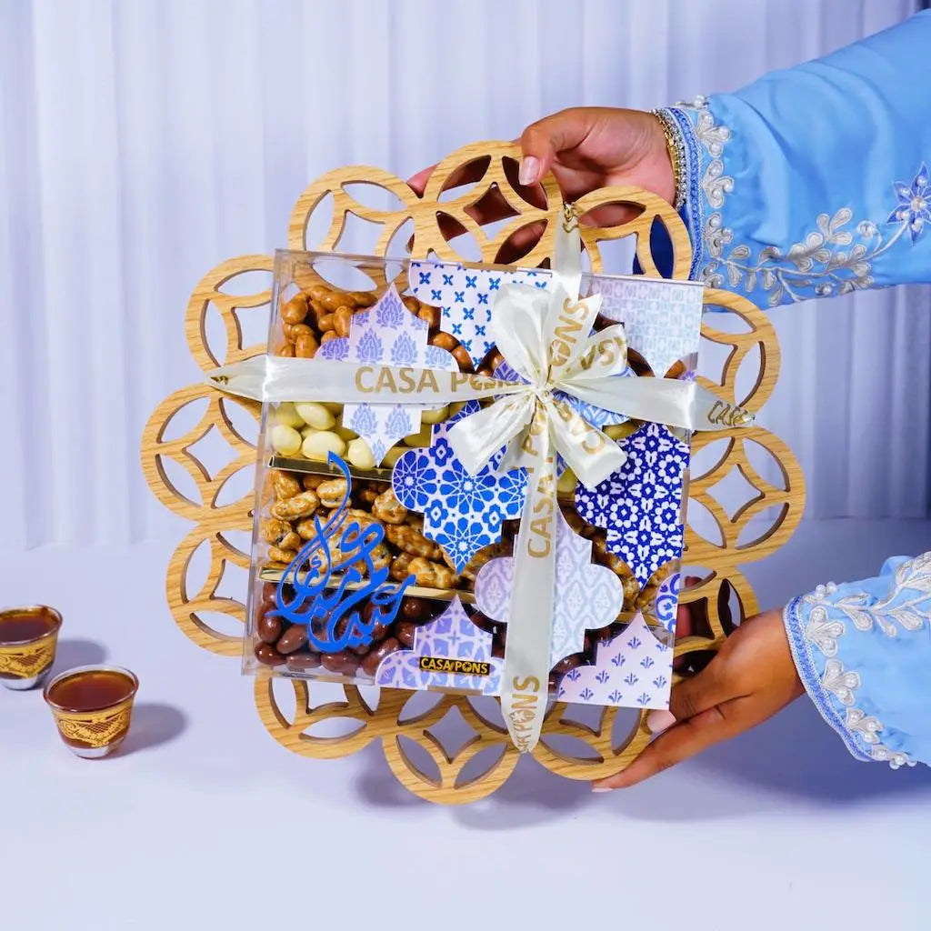 Blue Flower Wood Tray , wooden tray with subtle blue accents, filled with 1 kilogram of assorted pecan flavors: