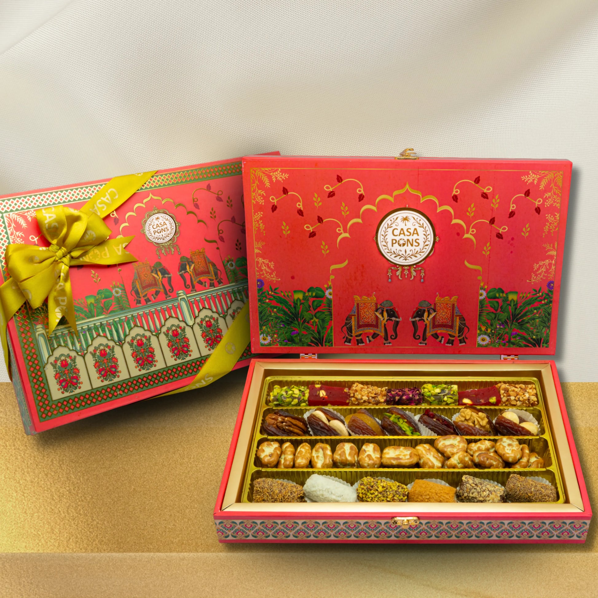 The Fushia Elephant Rectangle box includes 4 rows of our signature items perfect for the Diwali festival. It includes 4 rows that are filled with: