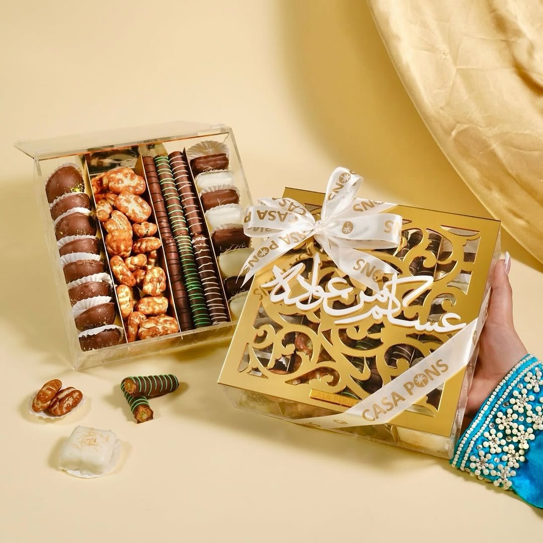 Stunning golden box with a charming window design. This luxurious box features an exquisite assortment of: