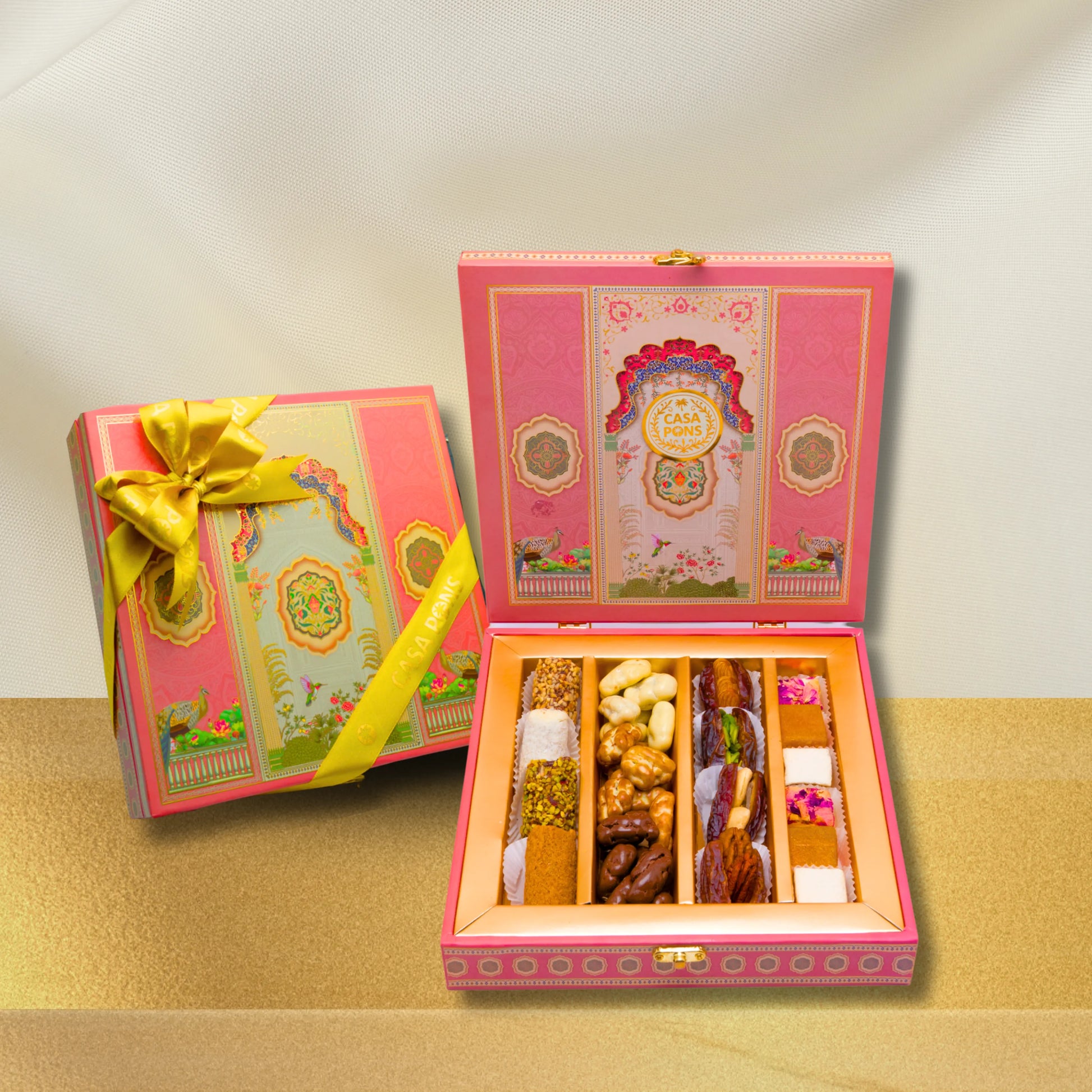 The Medium Pink Turquoise box includes includes 4 rows of our signature items perfect for the Diwali festival. It includes 4 rows that are filled with:
