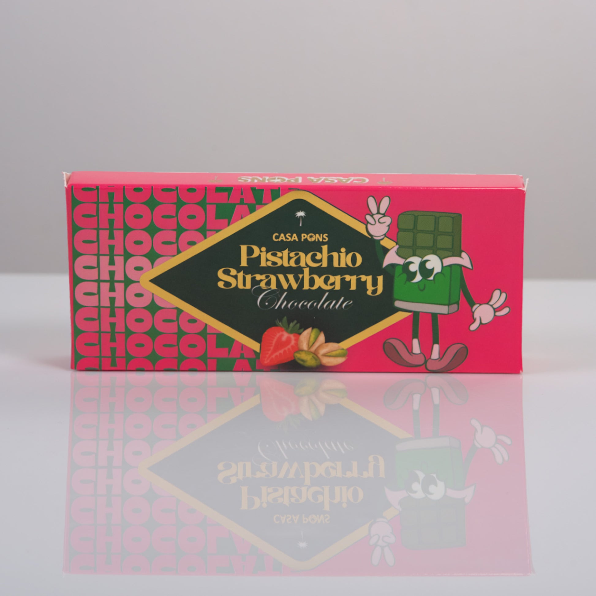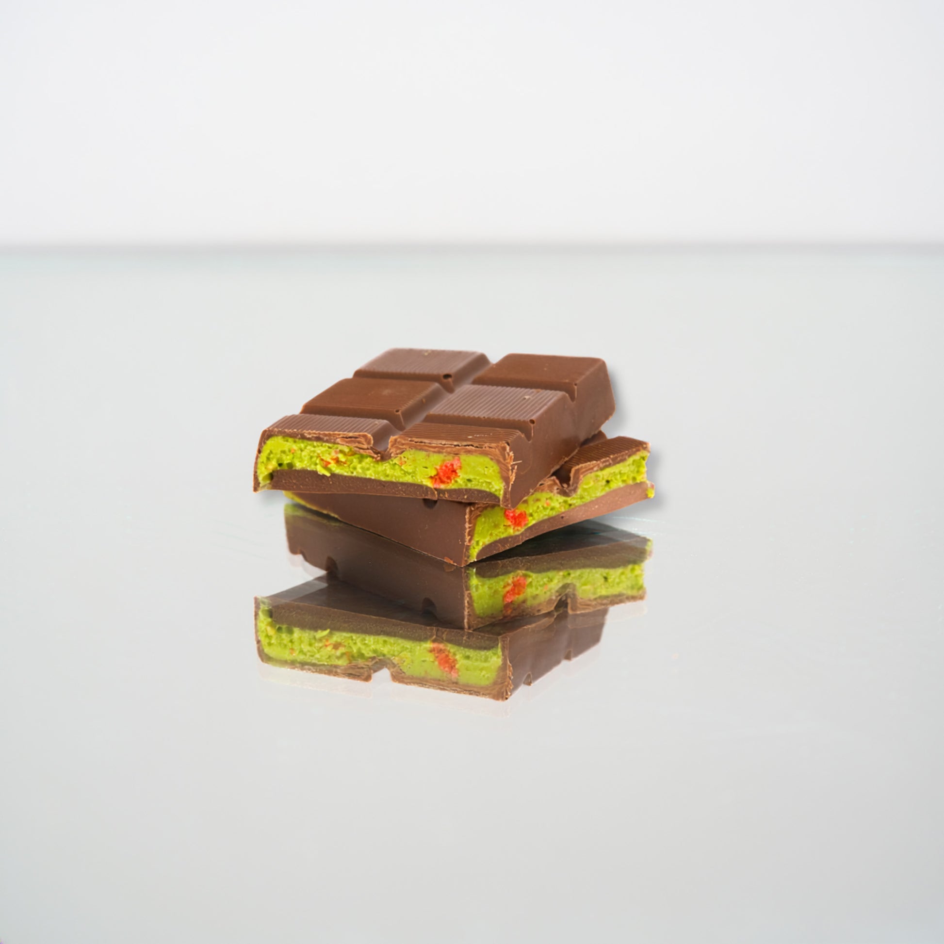 A vibrant garden in a bar. Roasted, savory pistachio crunch meets the sweet-tart burst of strawberry, all embraced by rich, creamy chocolate. A playful and perfectly balanced delight.