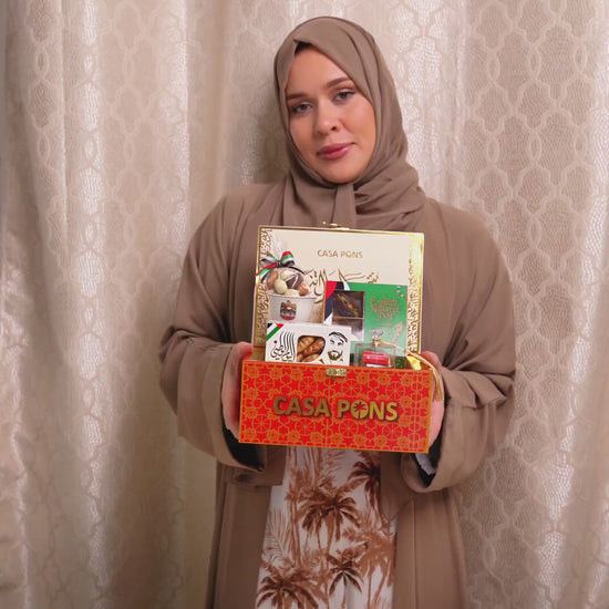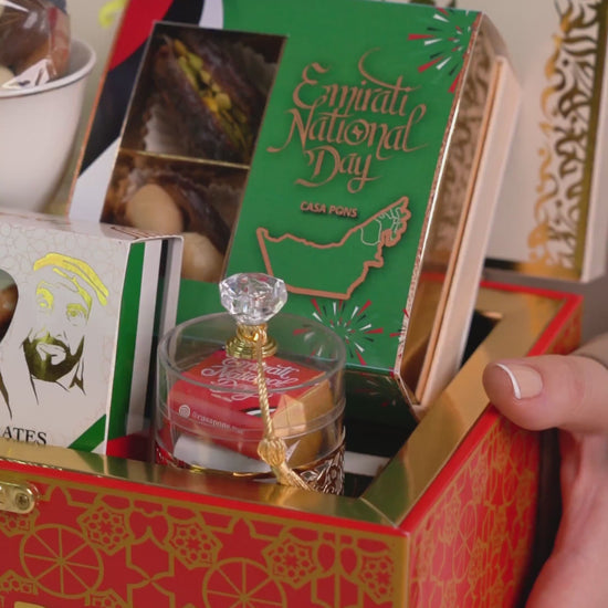 Celebrate the UAE National Day with our beautifully crafted red mini gift basket. This elegant arrangement includes a National Day box with stuffed dates, pecans, and kunafa chocolate, pistachio and hazelnut wafer chocolates, a traditional UAE gahwa cup, assorted nut dragee pouch, and a gold acrylic box with three square filled chocolates. A perfect gesture for festive gifting to clients, colleagues, or loved ones.