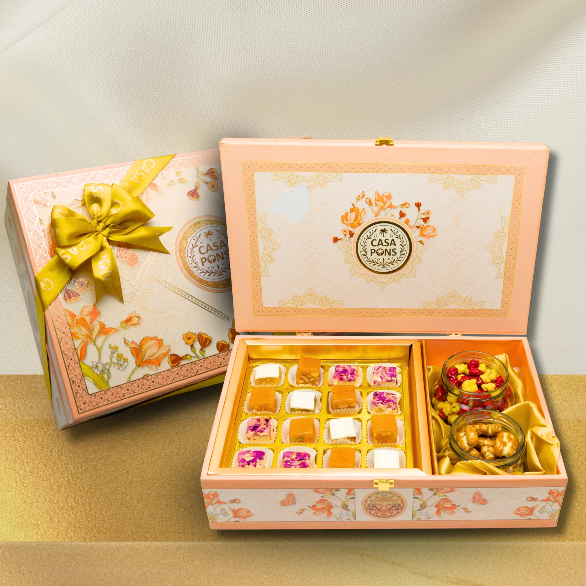 The Rose Gold Elephant Box includes a tray of our signature assorted malban in pistachio, rose, and apricot flavors, as well as 2 glass jars filled with our famous caramel pecan and colorful dragee sweets.