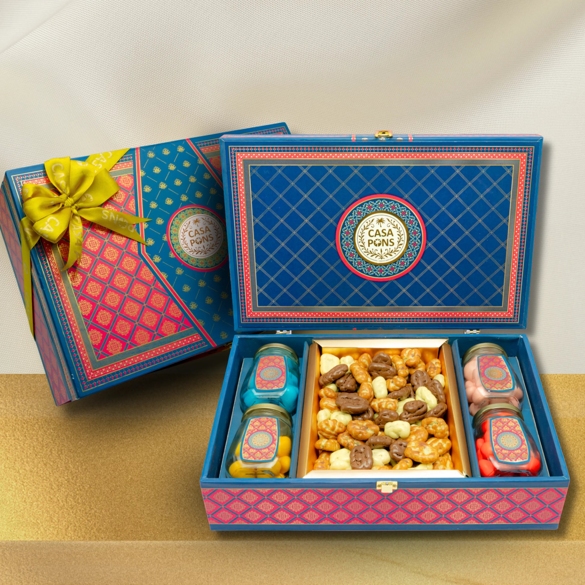 The Royal Blue Pink Print Box includes a large compartment of our signature pecan caramel as a mix of 3 flavors: white, caramel, and milk chocolate. The box also includes 4 jars filled with colorful sugar-coated almond dragées.