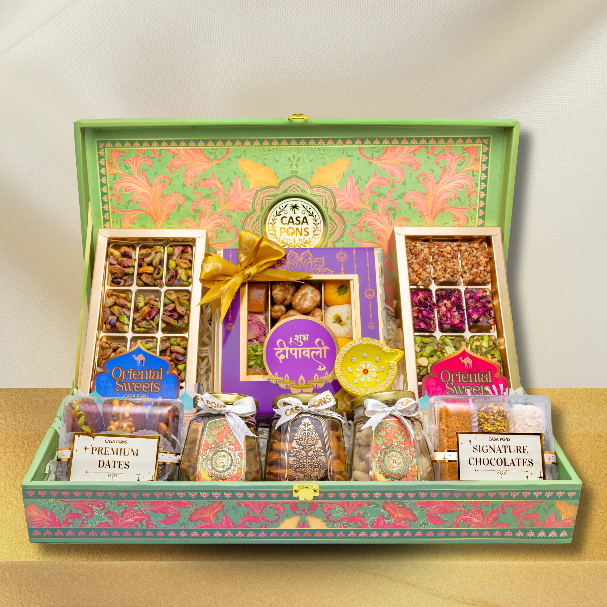 The basket includes a beautiful Diwali purple box filled with our signature pecan, traditional sweets, and an assortment of marzipan, as well as 2 large boxes of pistachio and assorted malban. In addition, it includes 2 small acrylic boxes of stuffed dates and chocolate wafers. It also includes 3 small jars of raw cashews, almonds, and raisins. All of which are decorated with a traditional diya and a handcrafted Indian box.