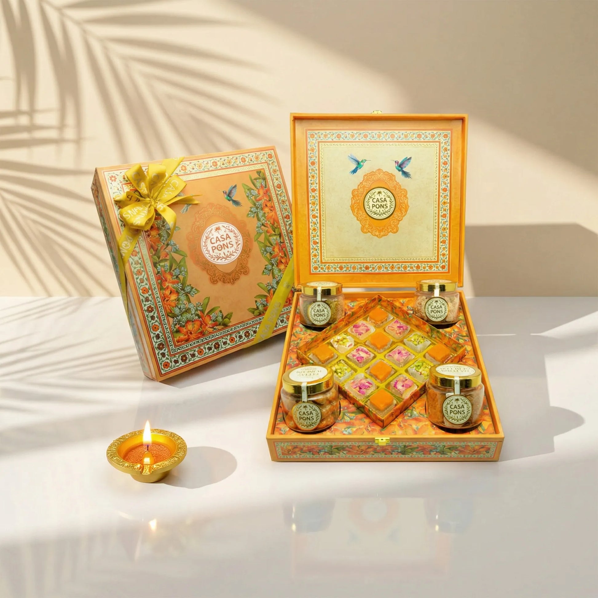 Beautifully designed and crafted with care, it’s the perfect choice for Diwali, weddings, family gatherings, or corporate gifting. A refined gift that blends gourmet flavors with elegant presentation.