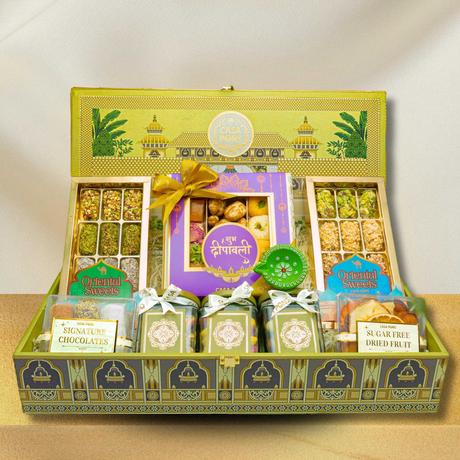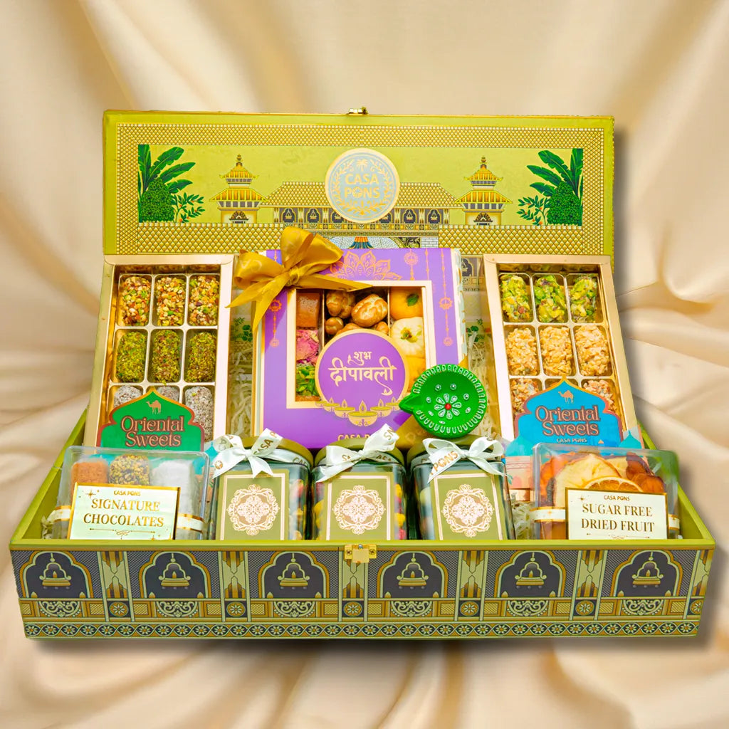 The basket includes a beautiful Diwali purple box filled with our signature pecan, traditional sweets, and an assortment of marzipan, as well as 2 large boxes of chocolate dates and assorted date balls. In addition, it includes 2 small acrylic boxes of chocolate wafers and sugar-free dried fruit. It also includes 3 small jars of healthy mixed nuts, colorful sugar dragées, and chocolate dragées, all of which are decorated with a traditional diya and a handcrafted Indian box.