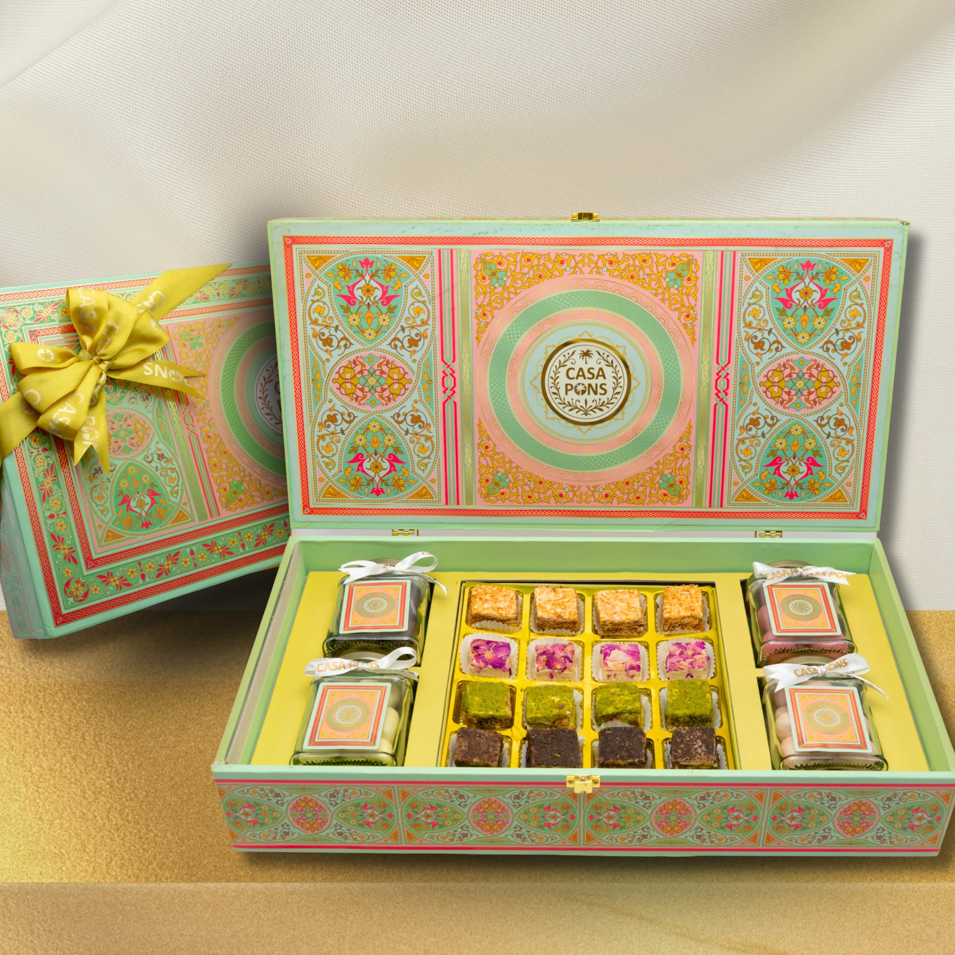 The Royal Mandala Rectangle Box includes a tray of our assorted layered malban nougat in addition to 4 glass jars filled with chocolate-coated freeze-dried raspberry and strawberry, as well as pecan caramel.