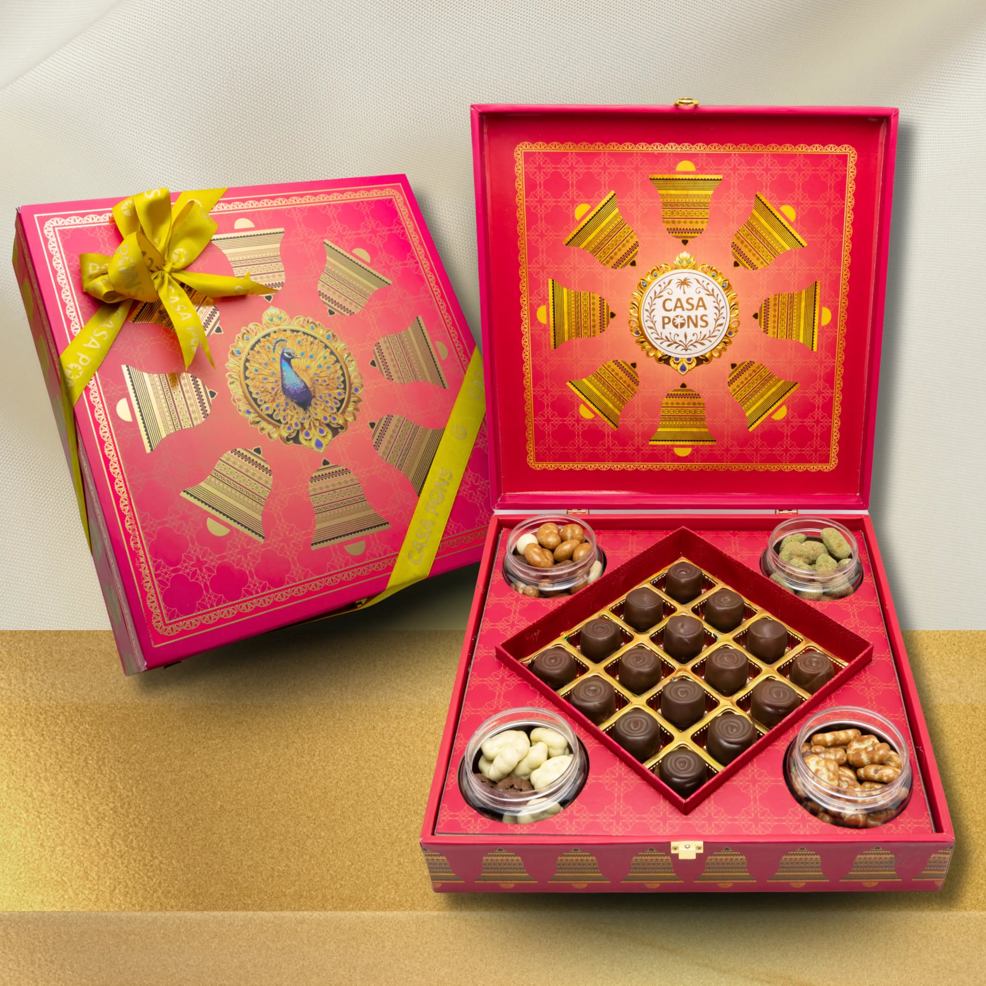 The Royal Pink Peacock Box includes a tray of our signature chocolate truffles as well as 4 jars filled with pecan caramel, assorted chocolate dragees, pecan mix chocolate, and pecan kunafa chocolate.