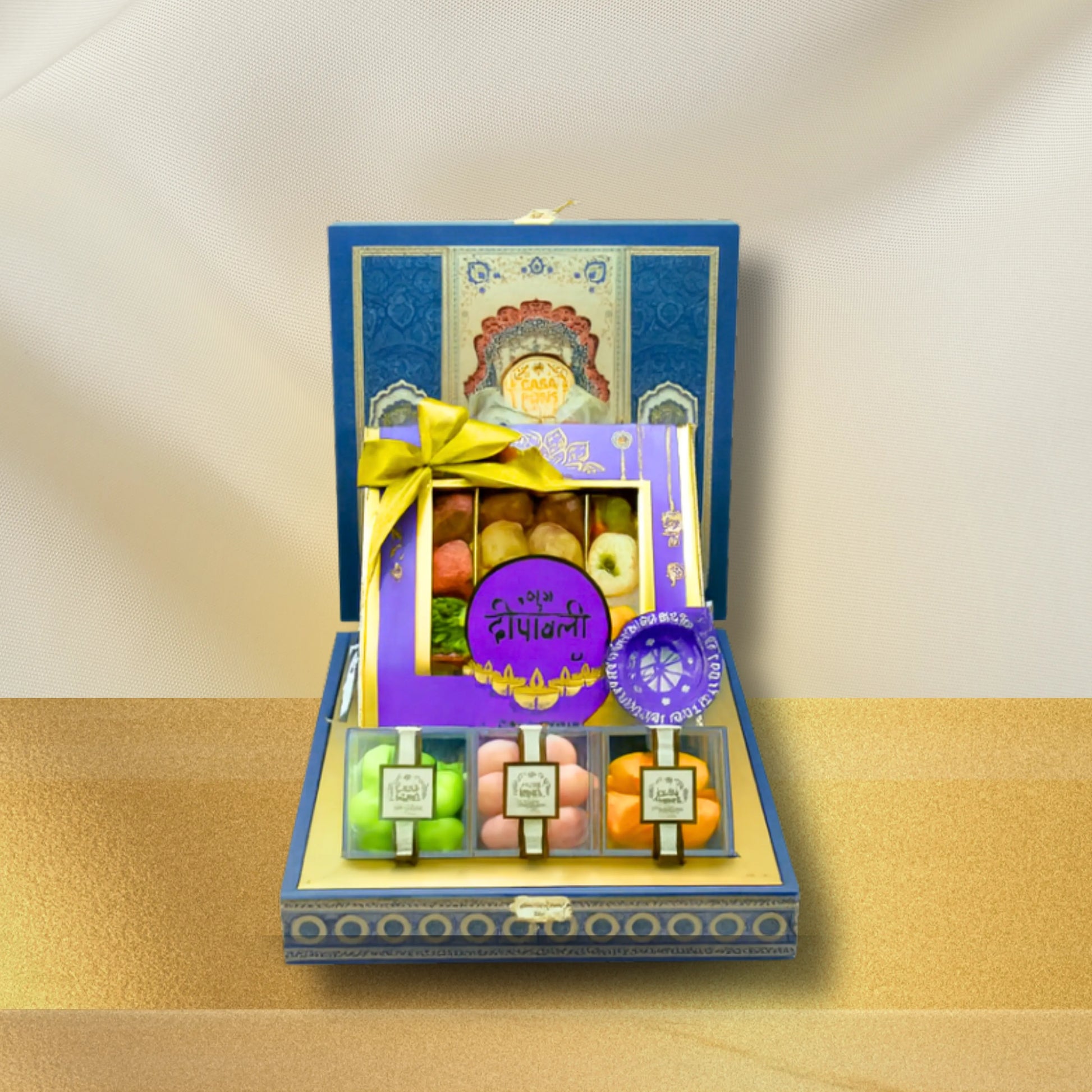 The Small Peacock basket includes a beautiful Diwali purple box filled with our signature pecan, traditional sweets, and an assortment of malban and marzipan. In addition, it includes 3 mini acrylic containers filled with colorful sugar-coated almond dragées, all of which are decorated with a traditional diya and placed in a handcrafted Indian box.