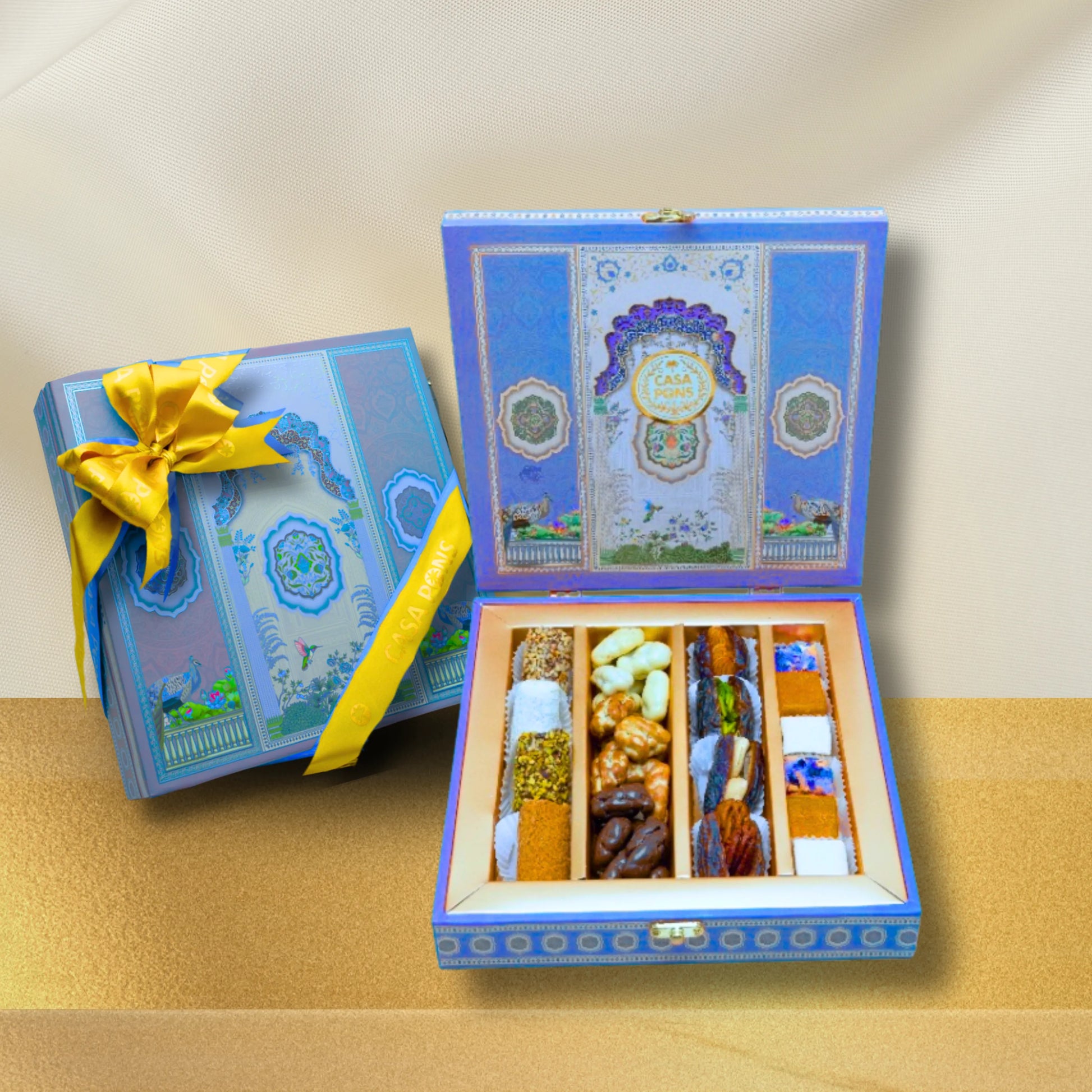The Small Peacock box includes 4 rows of our signature items perfect for the Diwali festival. The 1st row has our signature wafers that come in pistachio, hazelnut, lotus, and coconut fillings. The 2nd row has caramel, white, and milk chocolate pecans. The 3rd row has assorted nut-filled dates, and the 4th row has an assorted mawa oriental sweet.