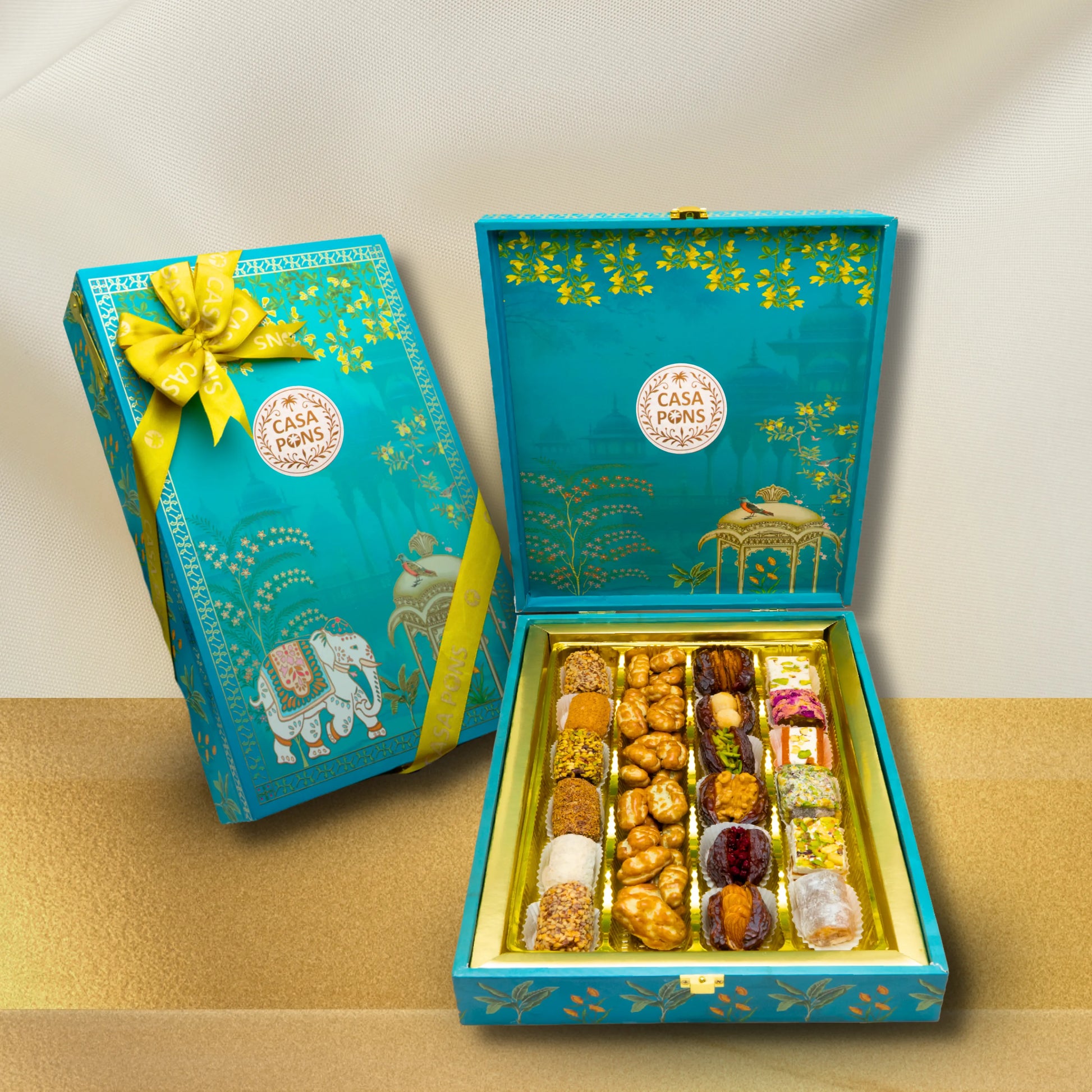 The Vertical Tuqouse box includes 4 rows of our signature items perfect for the Diwali festival. It includes 4 rows that are filled with: