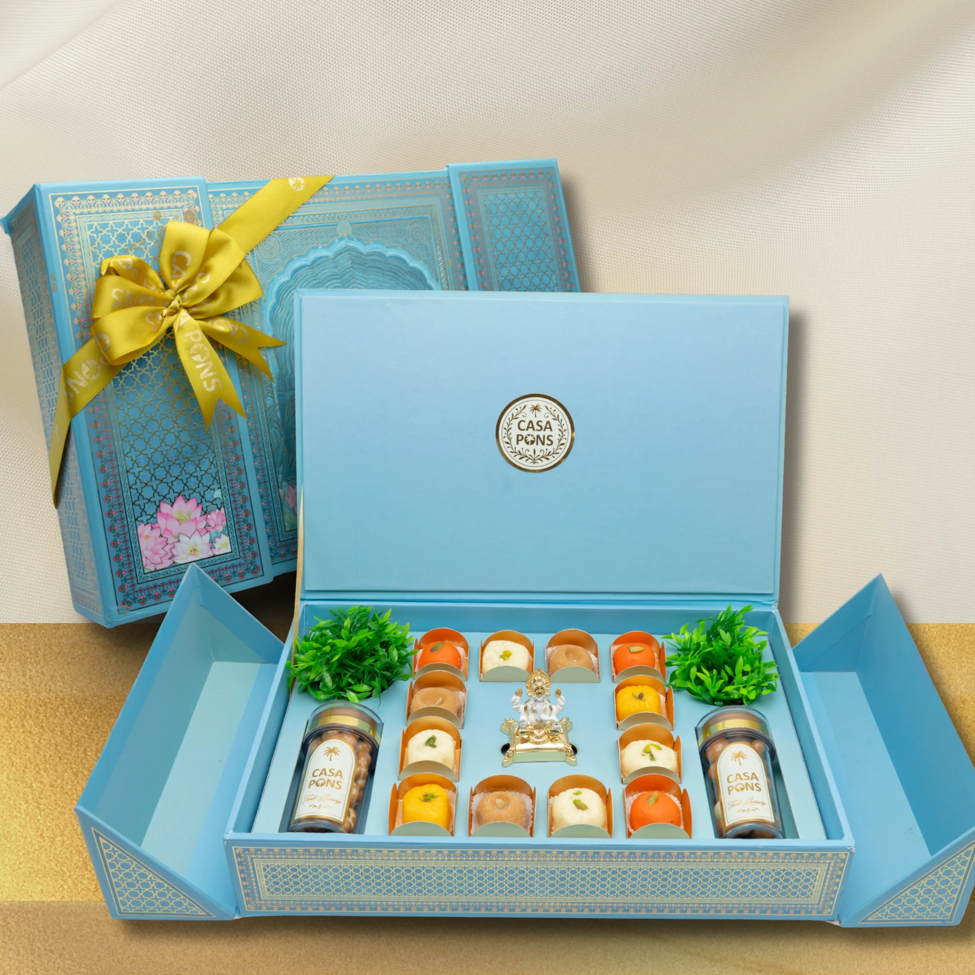 The VIP Royal Blue Rectangle Box is a 3way opening box which includes a tray filled with traditional and authentic indian sweets as well as 2 bottles of pecan caramel, and assorted dragee , all of which are decorated with a traditional symbolic status at the center.