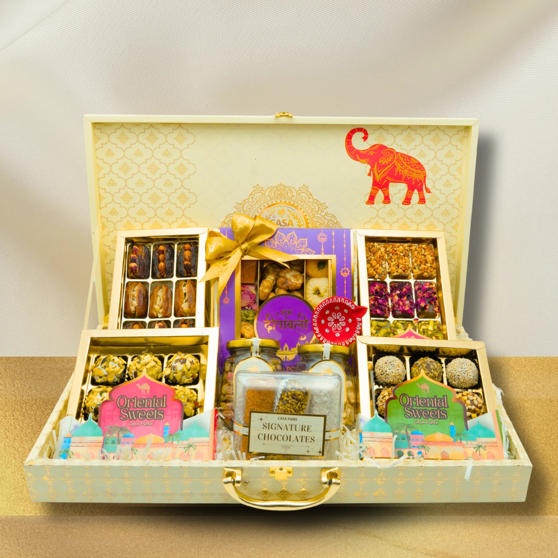 The basket includes a beautiful Diwali purple box filled with our signature pecan, traditional sweets, and an assortment of marzipan, as well as 2 large boxes of assorted and pistachio malban. In addition, it includes 2 small acrylic boxes of chocolate wafers and chocolate dates. It also includes 3 small jars of chocolate-coated freeze-dried strawberry and raspberry dragees, all of which are decorated with a traditional diya and a handcrafted Indian box.