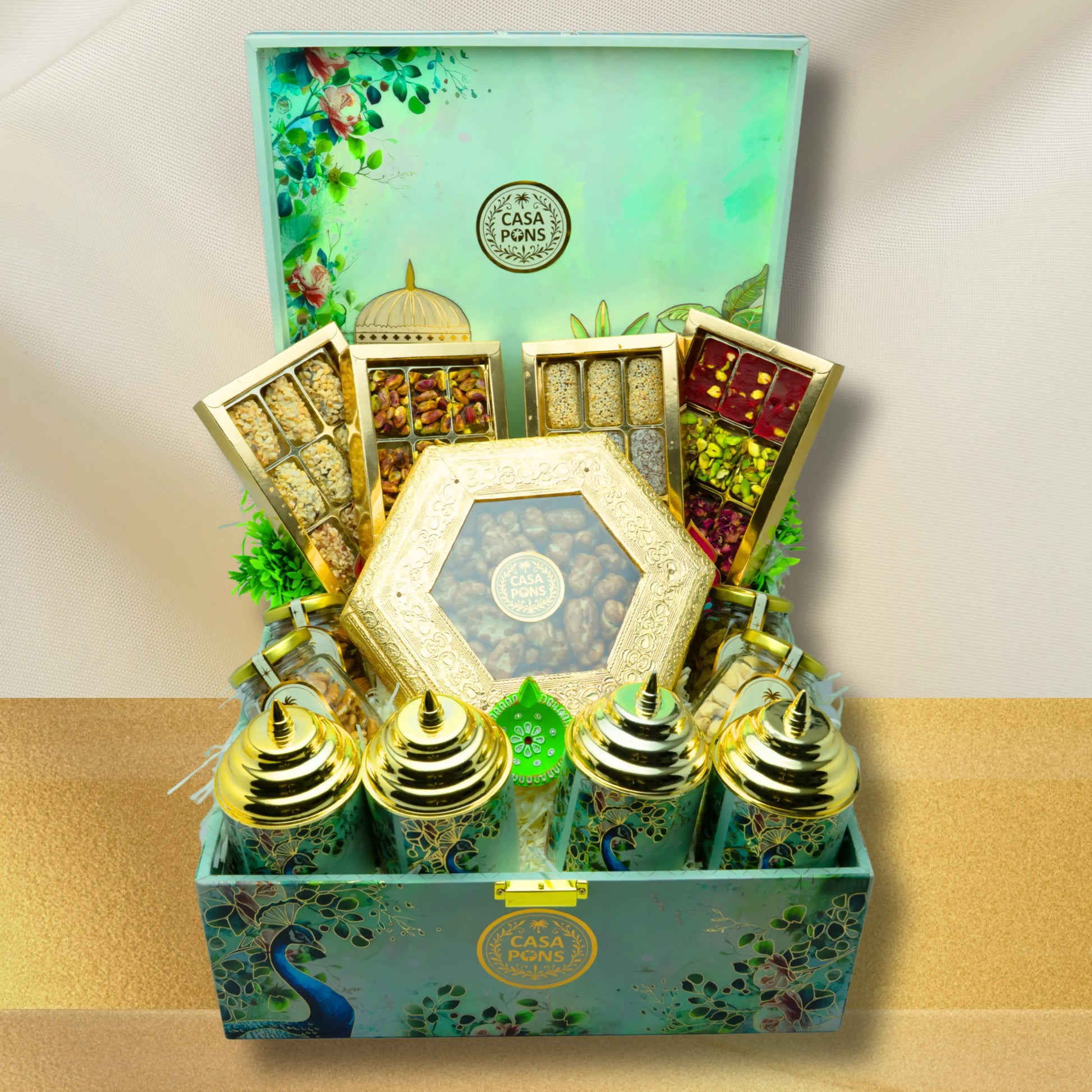 The basket includes a gold box filled with our signature pecans as well as 4 large boxes of assorted malban, chocolate dates, and date balls. In addition, it includes 4 jars of raw nuts and 4 bottles of assorted dragees, dehydrated vegetables, freeze-dried fruit, and mixed malban, all of which are decorated with a traditional diya and a handcrafted Indian box.